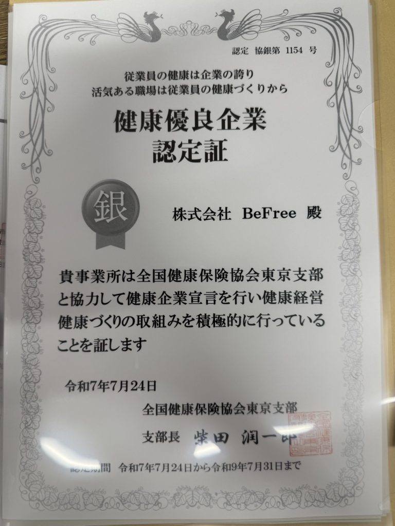株式会社BeFree(本社:東京都港区、代表取締役:皆川 祐輝、以下「当社」)は、この度、経済産業省と日本健康会議が共同で進める「健康経営優良法人認定制度」において、「健康経営優良法人2025([中小規模法人部門/大規模法人部門])」に認定されましたことをお知らせいたします。